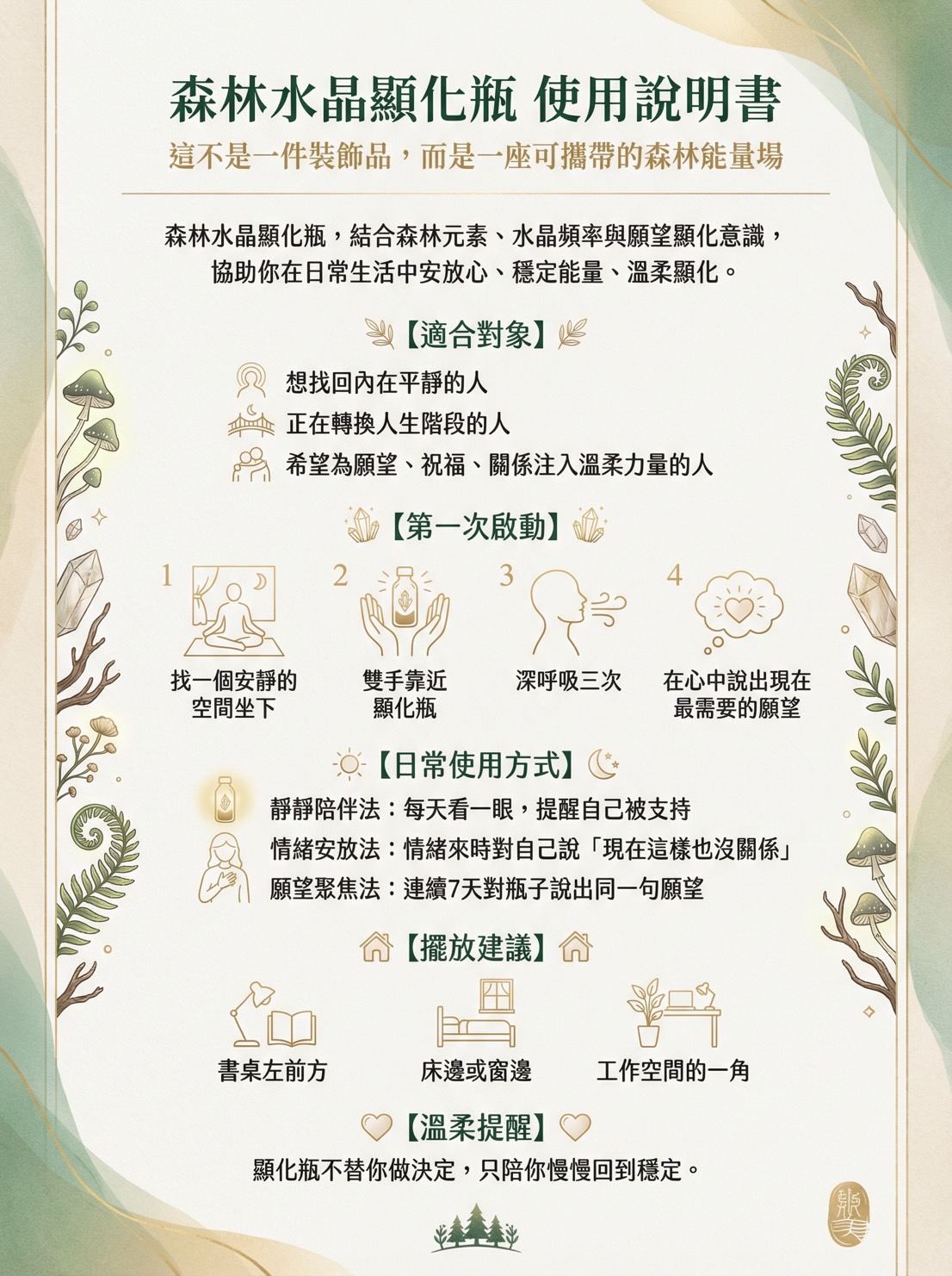 結合森林元素、水晶頻率與願望顯化意識,協助你在日常生活中安放心、穩定能量、溫柔顯化。
